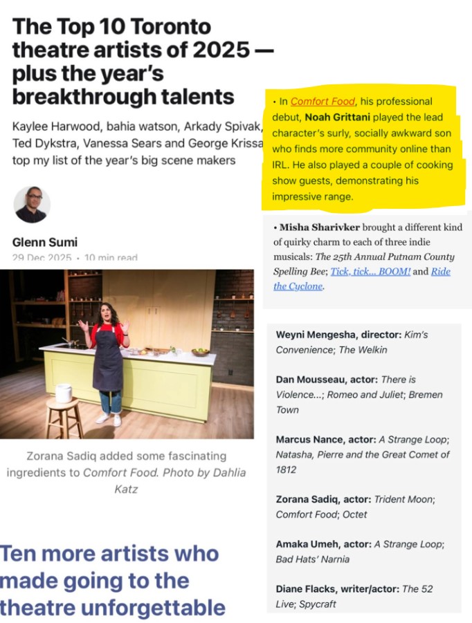 - "In Comfort Food, his professional debut, Noah Grittani played the lead character’s surly, socially awkward son who finds more community online than IRL. He also played a couple of cooking show guests, demonstrating his considerable range."